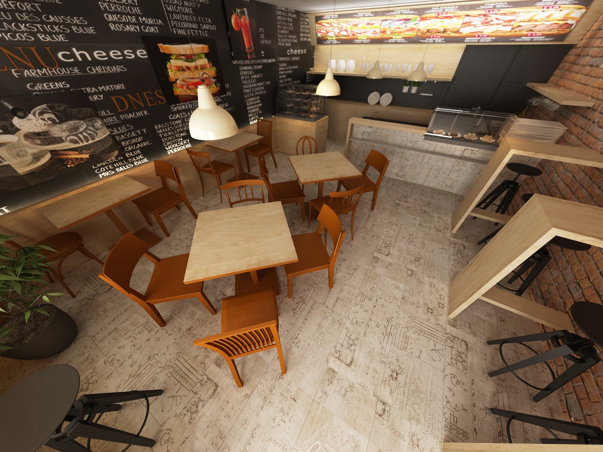 Malá bagetka v Starom meste. Laminátová podlaha s kobercovým vzorom, pôvodná tehlová stena a staré stoličky natreté do jednotnej farby zbytočne nepredražia interiér a dajú priestoru autentickosť. Jedna celá stena vyhradená pre textovo obrázkovú grafiku ponuky jedál a nápojov.