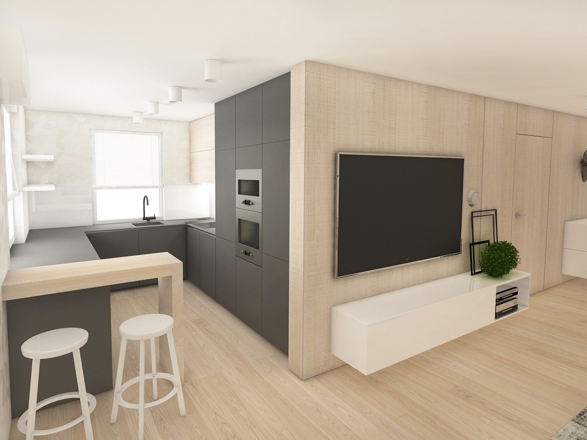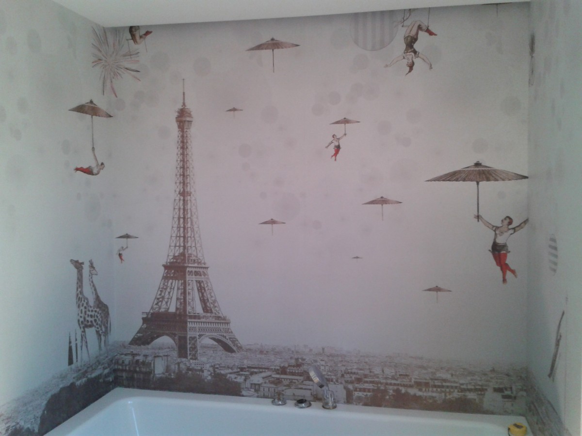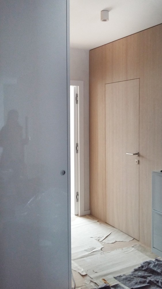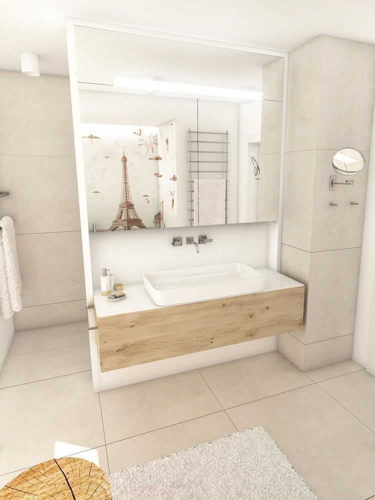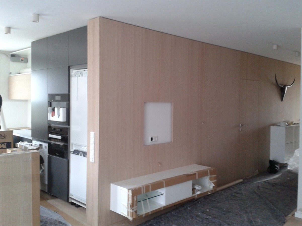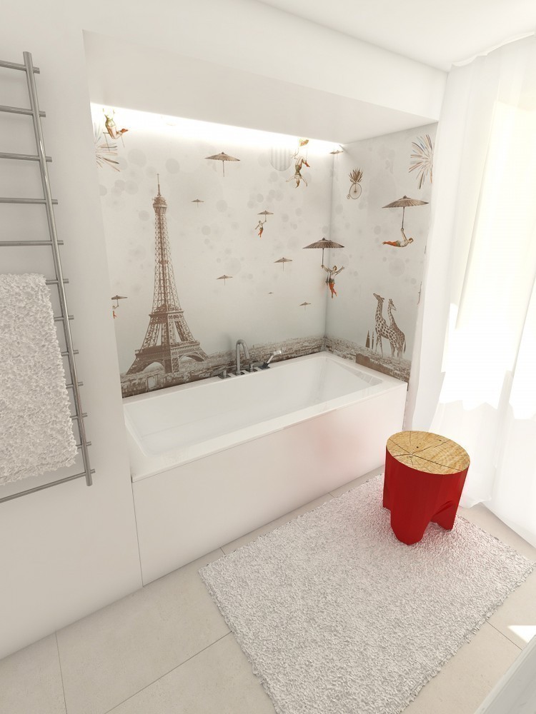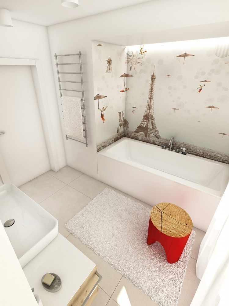 Bielený dub na parketovej podlahe skvele ladí s bielenou dubovou dyhou na obývačkovom obklade. V ňom sú zabudované dvere do spálne a detskej izby. Tmavá antracitová kuchyňa, biele tapety a nábytok a je to...V kúpeľni ako obvykle vodeodolná tapeta wallanddeco, na ktorú nedáme dopustiť. Tentoraz v snovo-parížskom duchu.