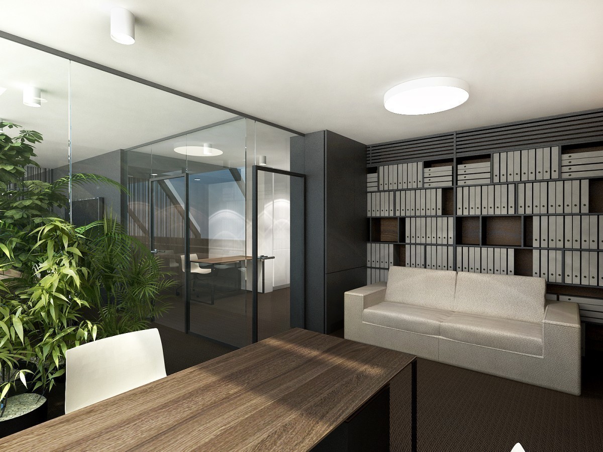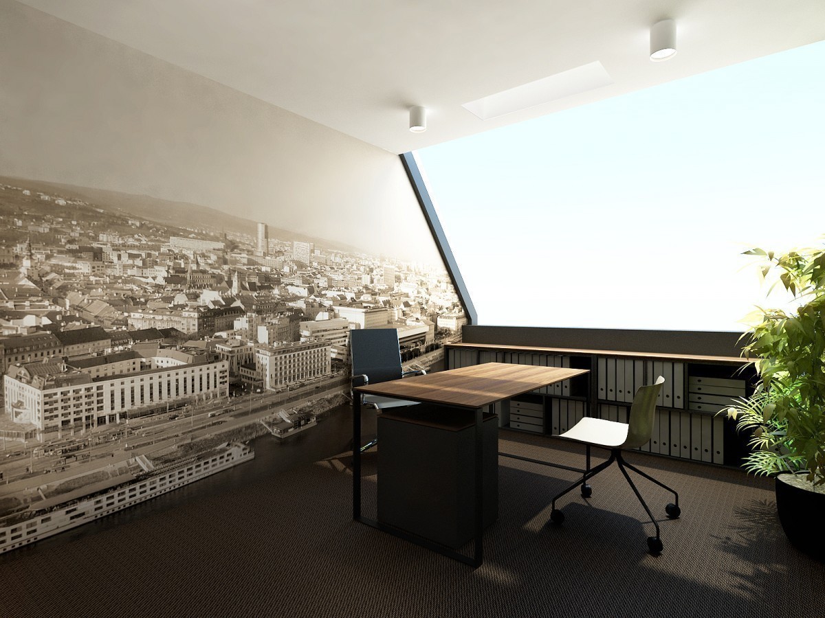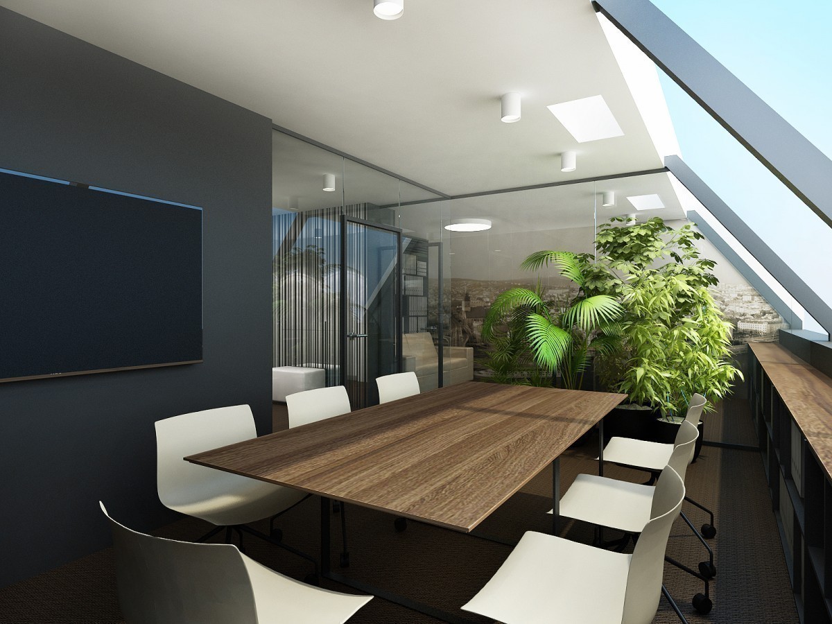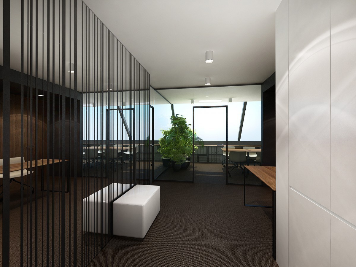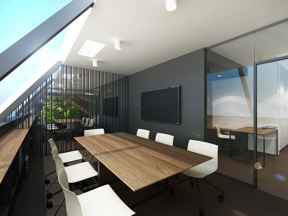 Otvorený priestor delený presklenými plochami, aby nič nezakrývalo výhľad z obrovského bezrámového okna, ktoré plynule prebieha celou šírkou kancelárie aj zasadačky. Optickým delením je skôr centrálny ostrov zelene.