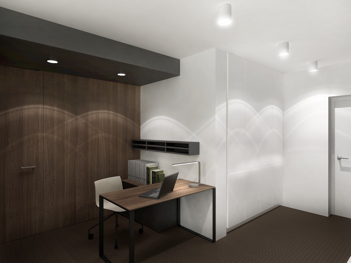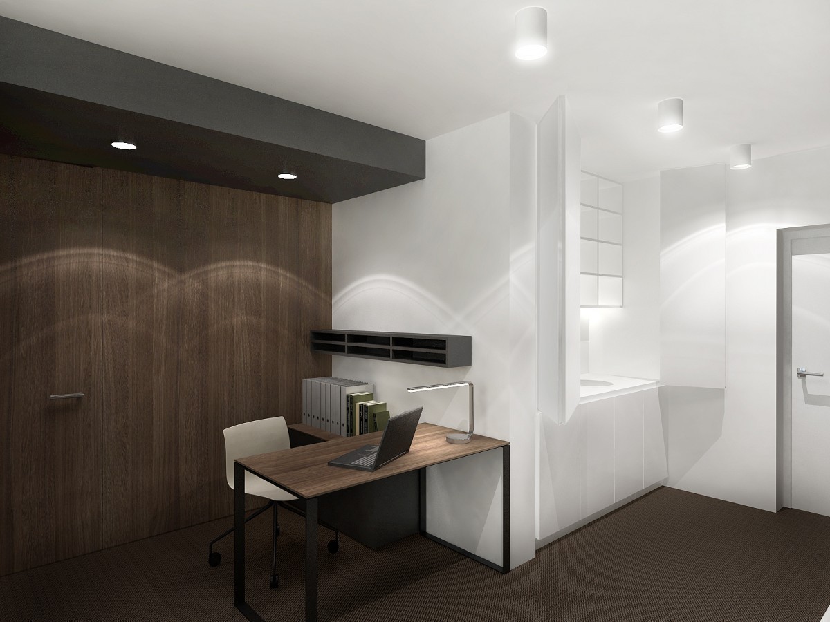 za pracovným miestom pre sekretárku sú dvere do kúpelne a wc zapracované v drevenom obklade