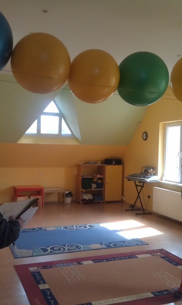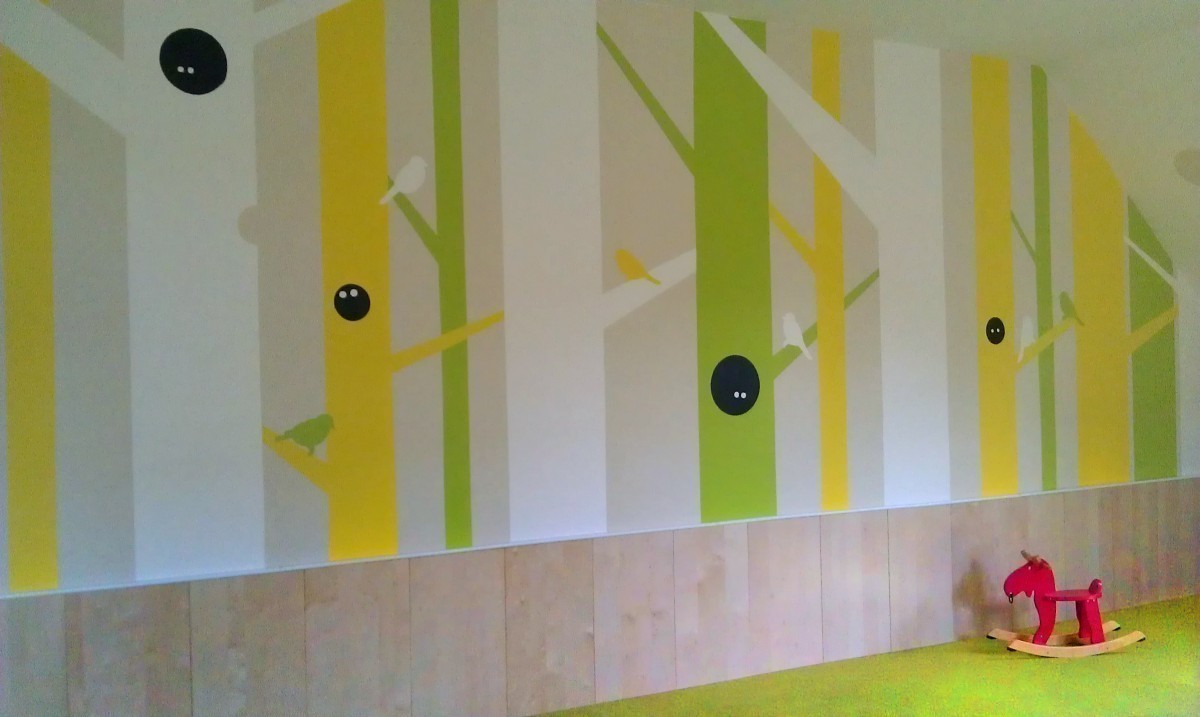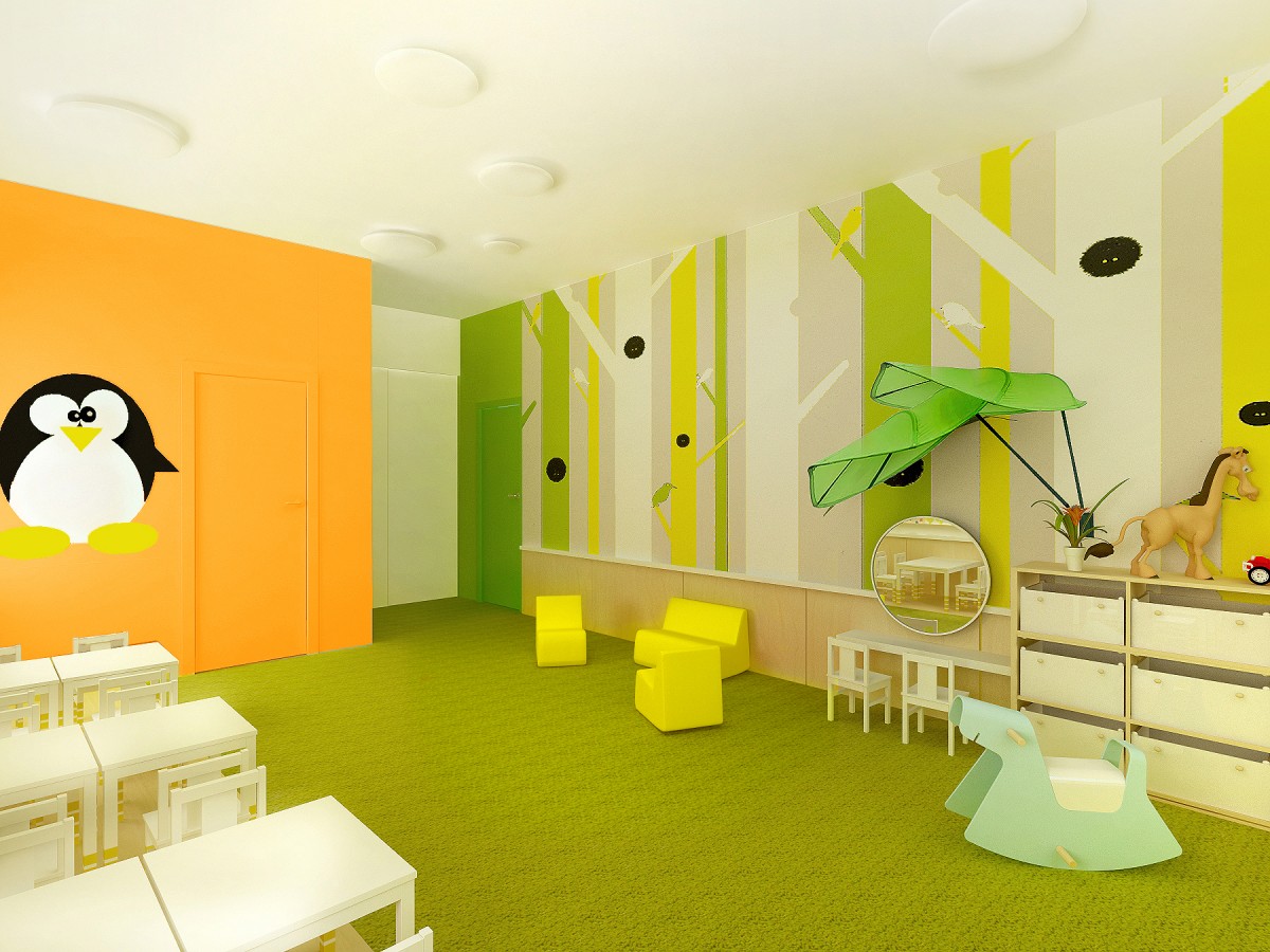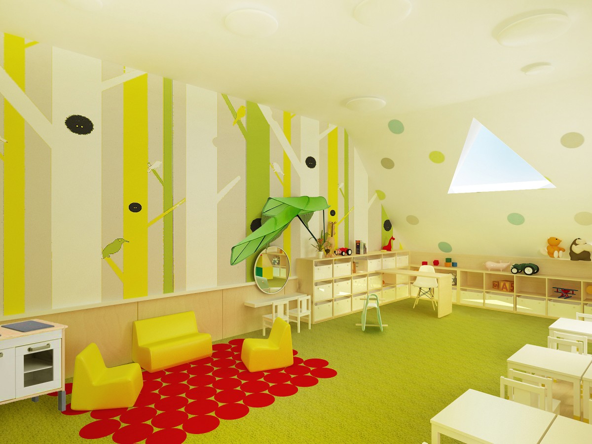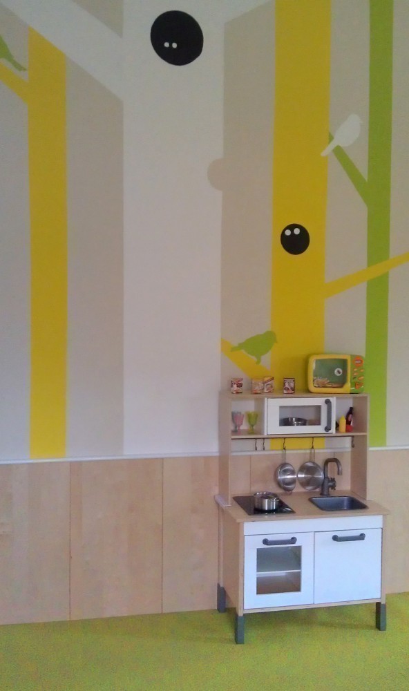 Jedna z dvoch hlavných hracích a výukových miestností. Základ farebnosti tvorí svieža zelená mäkkého celoplošného koberca. Doplnená je ďalšími pastelovými farbami v podobe grafickej maľby na stenách. Štylizovaný motív lesa je dostatočne živý, no svojou jednoduchosťou zbytočne nezaťažuje už aj tak plnú detskú myseľ...