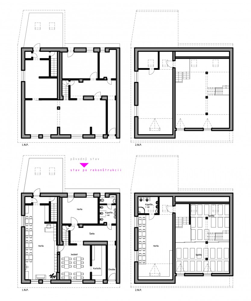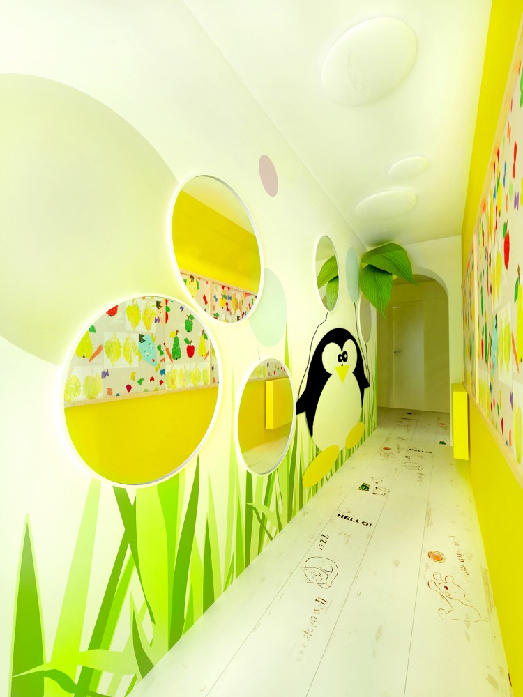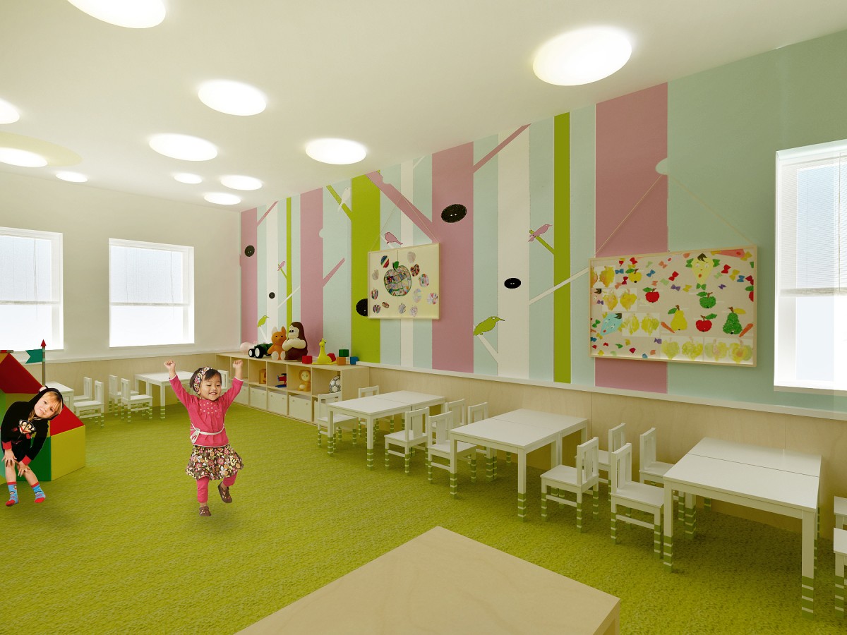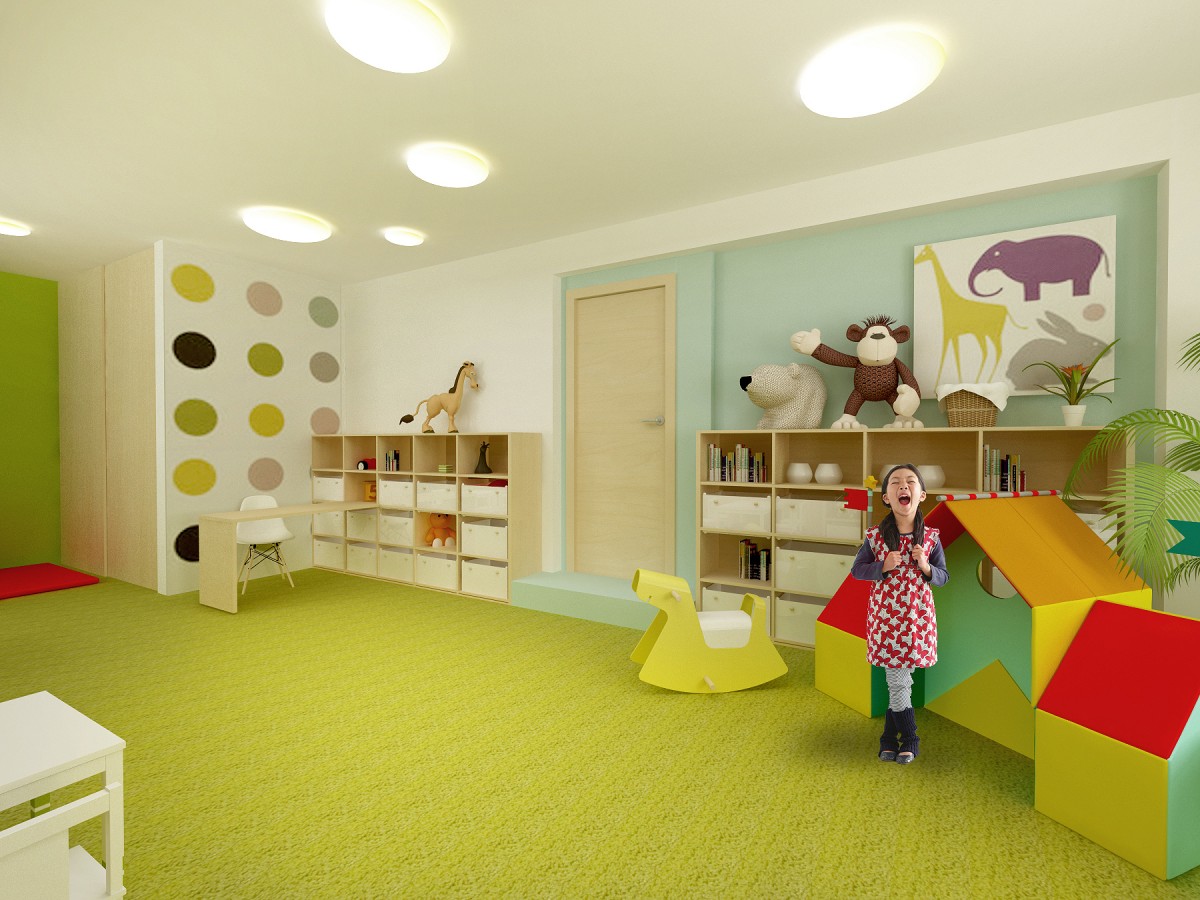 Jedna z dvoch hlavných hracích a výukových miestností. Základ farebnosti tvorí svieža zelená mäkkého celoplošného koberca. Doplnená je ďalšími pastelovými farbami v podobe grafickej maľby na stenách. Štylizovaný motív lesa je dostatočne živý, no svojou jednoduchosťou zbytočne nezaťažuje už aj tak plnú detskú myseľ...