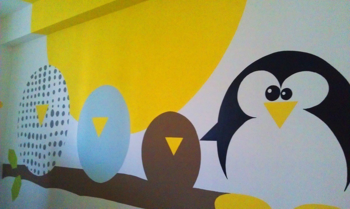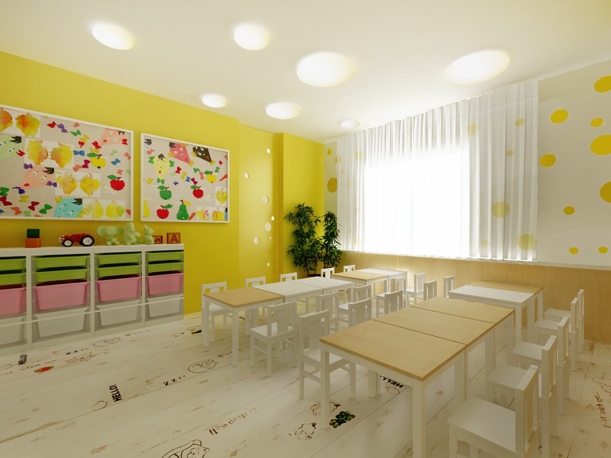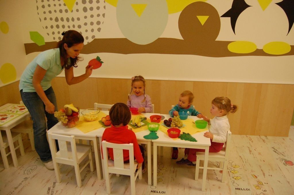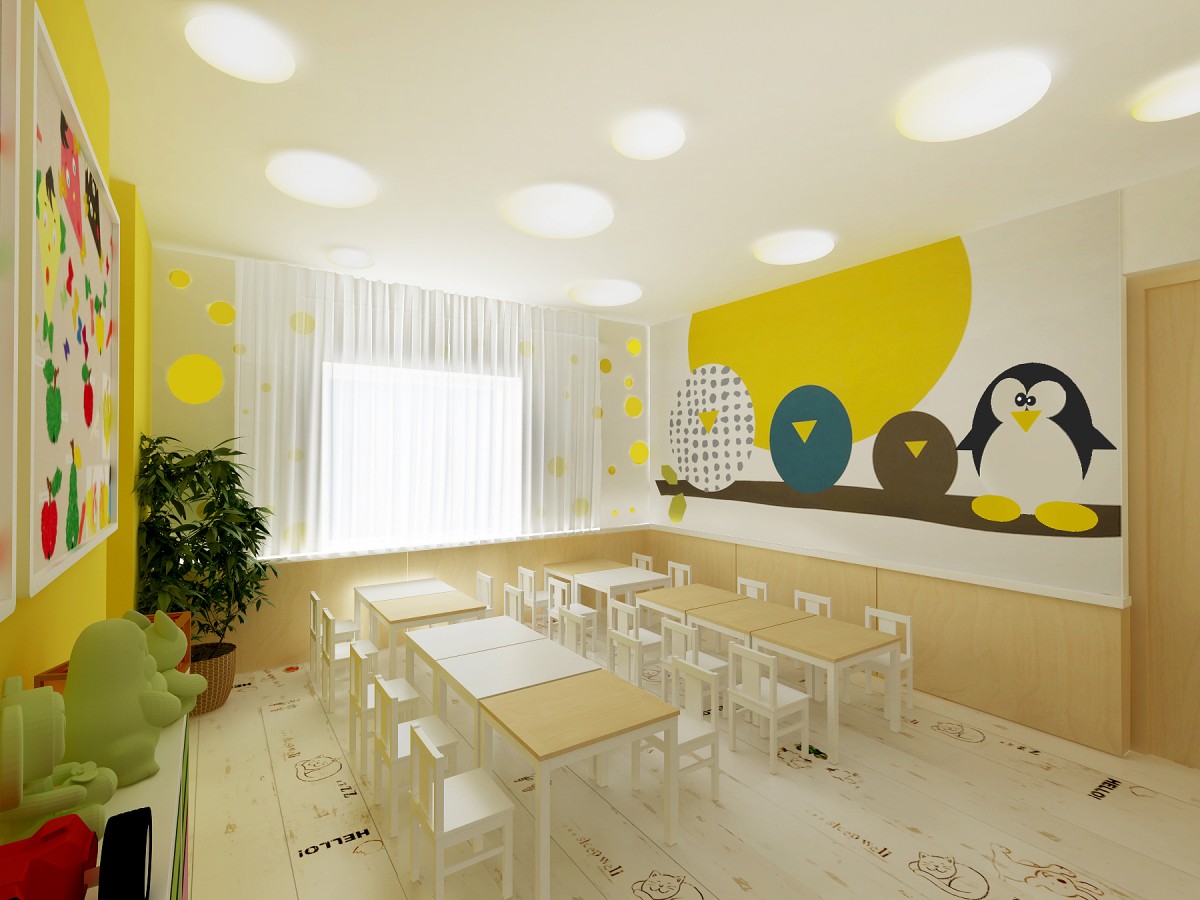 Žltá farebnosť a nástenná maľba s motívom slnka a sediacich vtáčikov pomáhajú deťom k chuti do jedla.